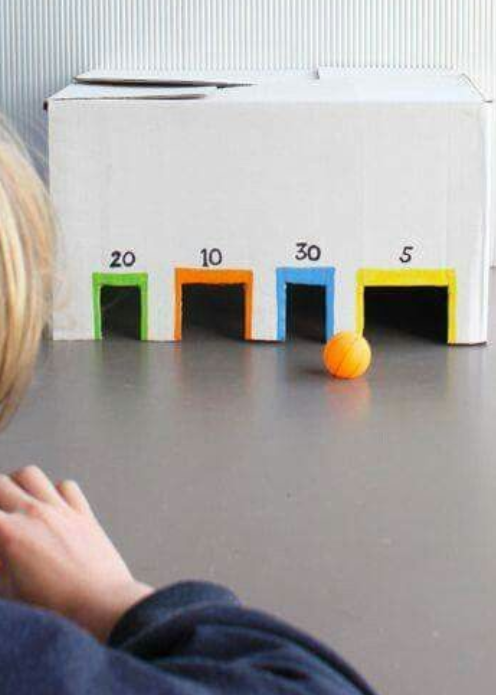 Knip 4 à 6 poortjes van verschillende grootte uit de doos. Geef elk poortje een cijfer (vb. 10, 20, 30, ...). Dit zijn het aantal punten dat je verdient, als je een knikker door het poortje kan rollen.